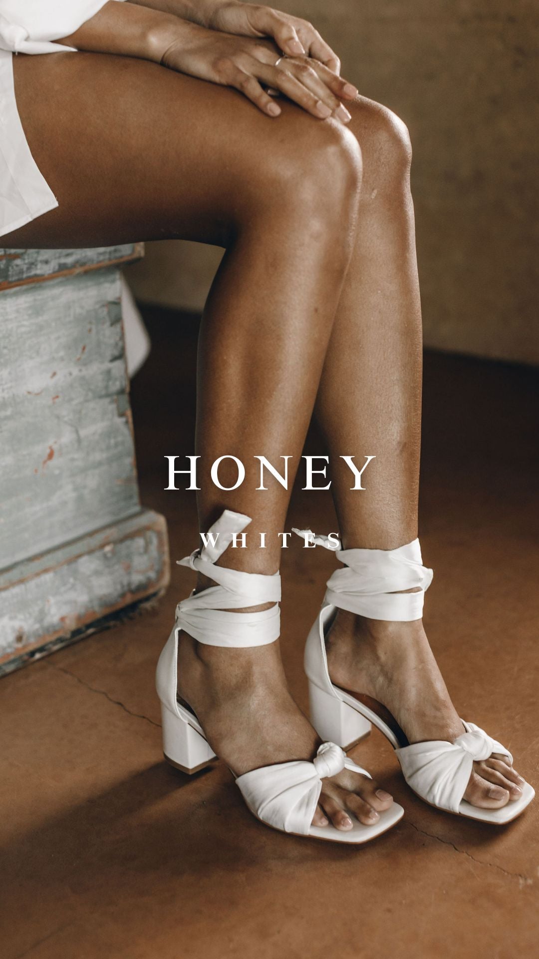 The Honey Sandals are an iconic style featuring a mid block heel with a top knot toe and a ribbon tie for added romance.